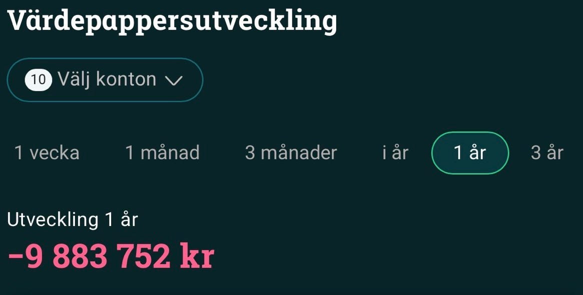 Samtidigt planerar jag nu för ett nytt projekt i portföljen. Från mitten till slutet av nästa vecka kommer jag lansera en separat “tradingportfölj”. Den kommer att vara på 100 000 kronor och syftet är att jobba mer aktivt med kortsiktiga positioner. Det blir ett sätt att komplettera det långsiktiga strategiska tänket med en mer taktisk trading-portfölj. Där kommer jag att investera i allt från aktier till valutor, obligationer och ibland hävstångsinstrument. Jag vill redan nu vara fullt transparent med att det är något helt nytt för mig och som jag inte gjort förut. Men eftersom jag i år tagit tjänstledigt och kommer lägga 100% av min tid på Substack och att skriva, analysera och investera utifrån makro så tycker jag detta ska bli en rolig utmaning Men det är också anledningen till att jag valt att “mjukstarta” med 100 000 SEK (mindre än 1% av mitt kapital). Mer om det kommer snart.