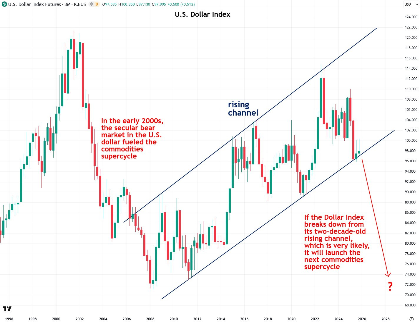 US Dollar Index har handlats inom en stigande kanal sedan mitten av 2000-talet, vilket speglar en långsiktig styrketrend i den amerikanska valutan. Nu befinner sig indexet nära kanalens nedre gräns och ett brott nedåt skulle innebära ett potentiellt historiskt skifte. I början av 2000-talet inleddes en sekulär björnmarknad i dollarn som sammanföll med starten på en bred råvaruboost (det som kom att kallas en supercykel). Den fasen drev upp priserna på allt från olja till koppar, guld och jordbruksprodukter.