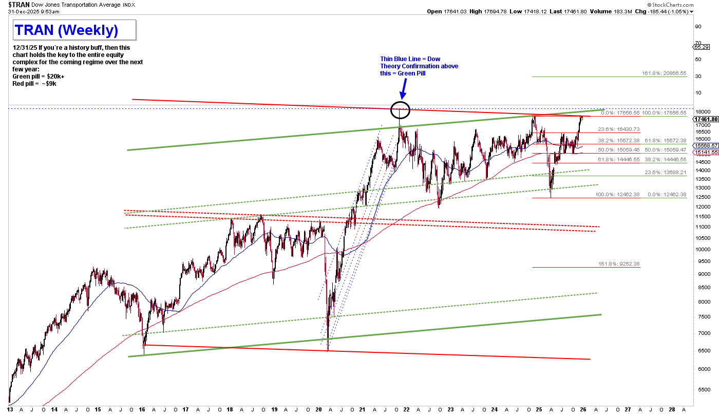Men vi är inte där än. Vi svävar precis under gränsen och frågan är om vi tar “det gröna pillret” (som pekar mot 20 000-nivån) eller det röda (som öppnar för en nedgång till under 10 000). Den här typen av tekniska vägskäl är inte ovanliga efter långa uppgångsfaser. Vad som händer härnäst kan komma att definiera hela marknadsregimen de kommande åren.