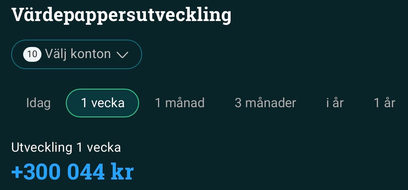 Denna vecka har portföljen avkastat +300 045 SEK (avrundat till +300 tusen kronor)