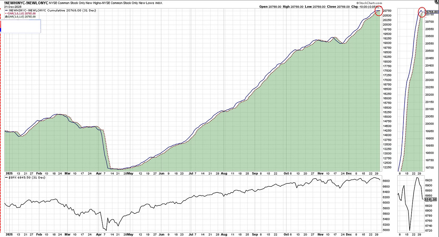 Vid första anblick ser det ut som att allt är frid och fröjd. Indexnivåerna är höga, SPX avslutade året nära sina toppar och tekniskt momentum finns fortfarande kvar. Men under ytan syns nu tydliga tecken på att marknadsbredden börjar försvagas, något som ofta agerar som en tidig varningssignal inför potentiella omslag.