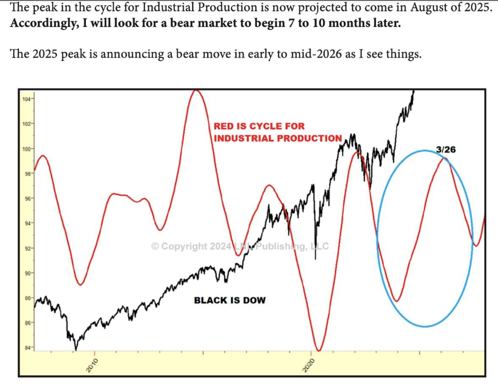 Larry Williams (som är lite av en legend inom cykelanalys) noterar att toppen i den amerikanska industriproduktionen sannolikt inträffade i augusti 2025. Baserat på tidigare mönster förväntar han sig att en björnmarknad tar form omkring sju till tio månader senare, vilket skulle peka mot våren 2026 som ett kritiskt fönster för större marknadsförändringar.