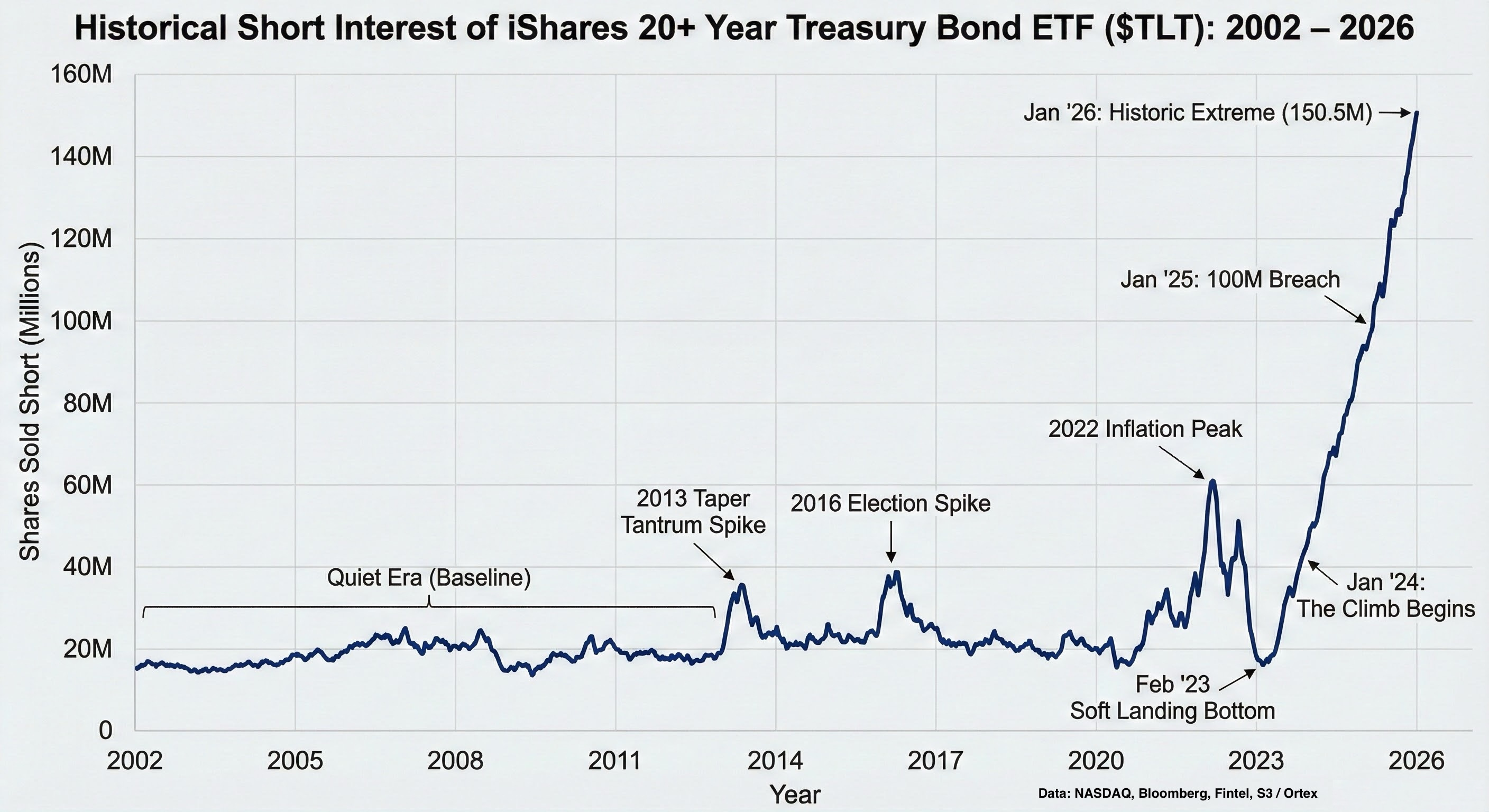 Men kanske den mest extrema datapunkten just nu finns i obligationsmarknaden. Shortpositioneringen i $TLT – ETFen som spårar amerikanska långräntor. Den har exploderat till över 150 miljoner aktier. Det är en tiofaldig ökning på mindre än tre år, och motsvarar nu 27% av det totala utbudet. Den här typen av positionering är extrem (även utifrån historiska mått) och har tre standardavvikelser över 20-årssnittet.