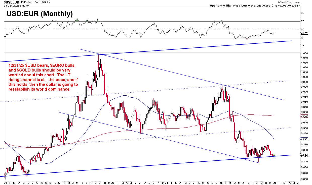 Samtidigt som aktiemarknaden tvekar och räntekurvan signalerar oro, ser vi en intressant utveckling på valutamarknaden. USD/EUR-grafen visar att dollarn trots all tal om dess försvagning fortfarande håller sig inom en långsiktig stigande kanal (jag skriver mer om detta lite längre ner).