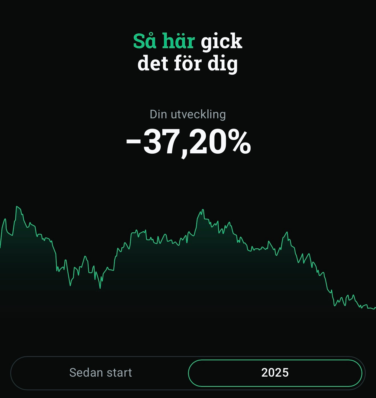 Just nu är min portfölj på totalt 17 404 080 SEK (avrundat till 17,4 miljoner kronor) och den avkastade -37,20% under 2025.