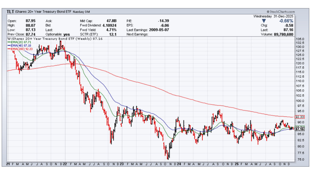 TLT-grafen bekräftar denna potentiella vändning. Efter en utdragen nedgång från 2020 till slutet av 2023 har priset börjat stabilisera sig. De kortare glidande medelvärdena (20 och 40 veckor) håller nu jämna steg med priset, och marknaden verkar bygga upp för ett tekniskt utbrott samtidigt som den fundamentala positioneringen är extremt ensidig. Med priset fortfarande under 200-veckorsmedelvärdet återstår visserligen motstånd att övervinna, men läget är riggat för en rekyl.