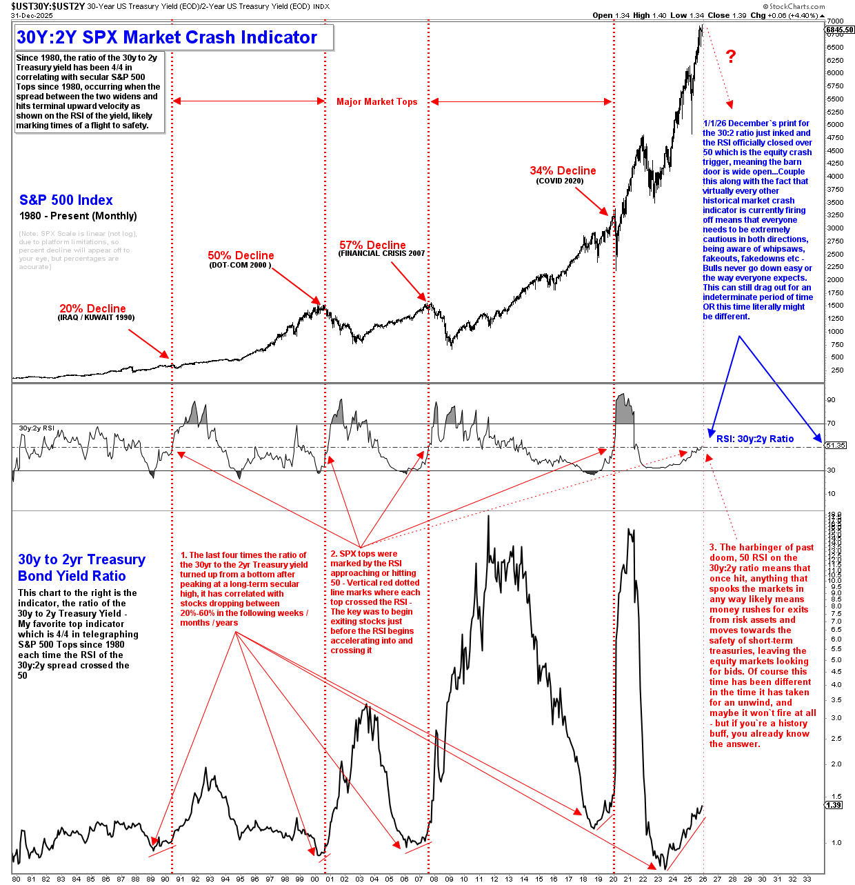 När räntekurvan börjar smått viska om fara är det värt att lyssna lite extra. I flera decennier har förhållandet mellan den 30-åriga och 2-åriga amerikanska räntan agerat som en sorts mätare för aktiemarknaden. Varje gång RSI för denna räntekurva har brutit upp över 50 har det sammanfallit med större börstoppar och efterföljande nedgångar på mellan 20% till 57%. December 2025 markerade ännu en sådan signal då RSI har återigen stängt över 50 och historien visar att det sällan sker utan konsekvenser.
