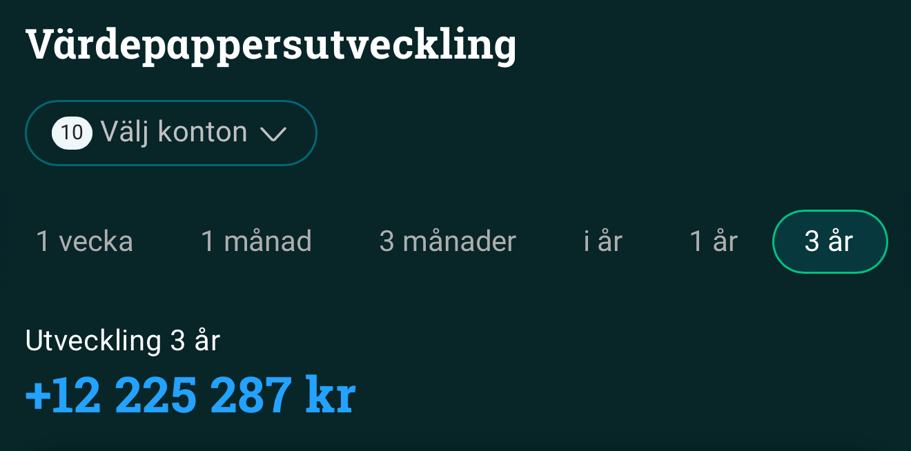 Portföljen har från och med idag och tre år tillbaka avkastat +12 225 287 SEK (avrundat till 12,2 miljoner kronor).