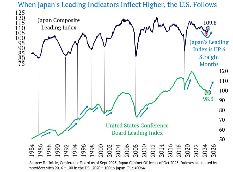 Japans ledande indikatorer har nu stigit sex månader i följd, något som historiskt ofta signalerat att även den amerikanska konjunkturen är på väg att vända. Landet fungerar ofta som en förlöpare i den globala cykeln, särskilt eftersom ekonomin är starkt exponerad mot handel och industriproduktion. När Japan börjar röra sig uppåt brukar det inte dröja länge förrän andra stora ekonomier följer efter.