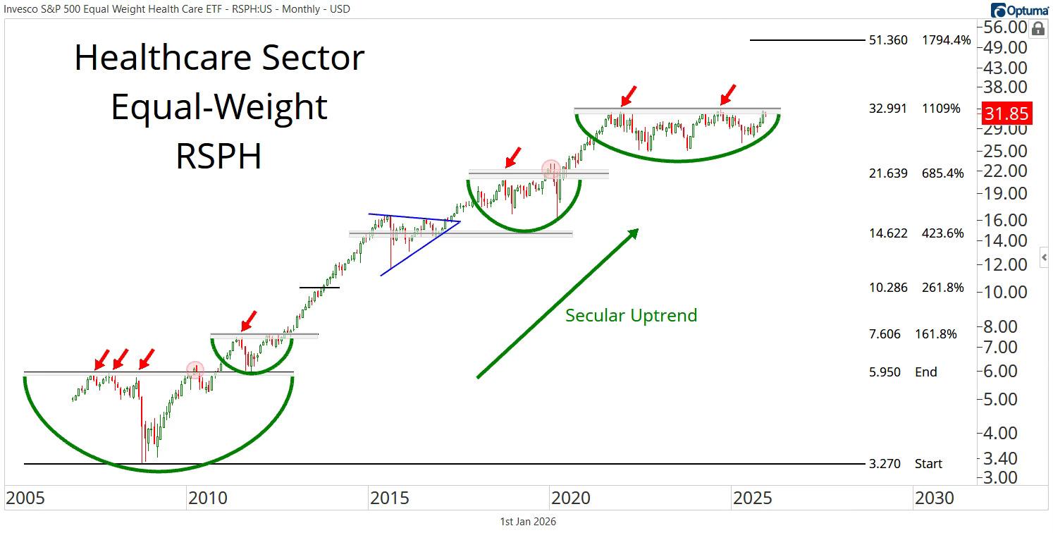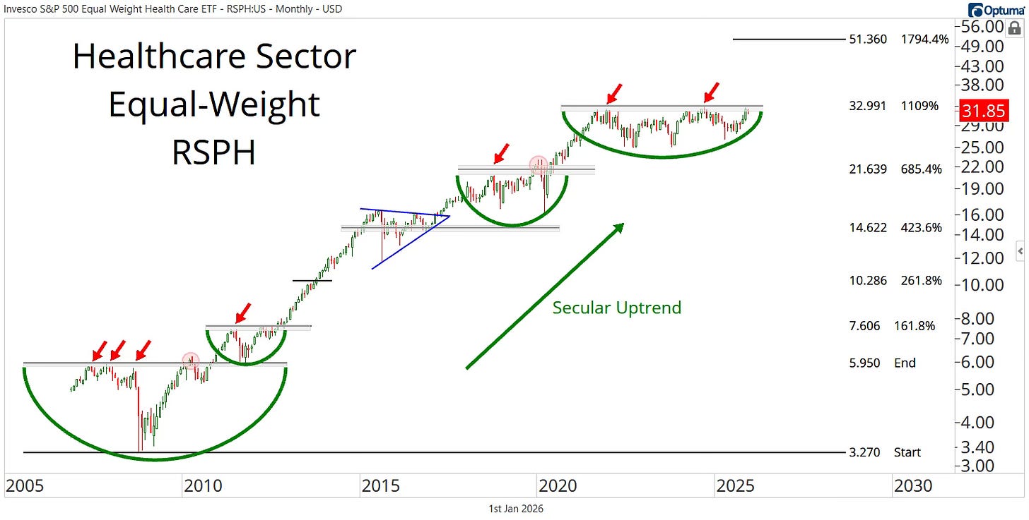 Hälsosektorn har under två decennier rört sig i en tydligt stigande struktur med återkommande perioder av konsolidering följt av kraftfulla utbrott. Diagrammet visar hur sektorn, representerad av RSPH (Equal Weight Health Care ETF), befunnit sig i en sekulär upptrend där varje större basformation till slut brutits uppåt och gett utrymme för kraftig vidareuppgång. Nu står vi åter inför ett potentiellt avgörande läge där kursen trycker mot motståndszonen från de senaste åren.