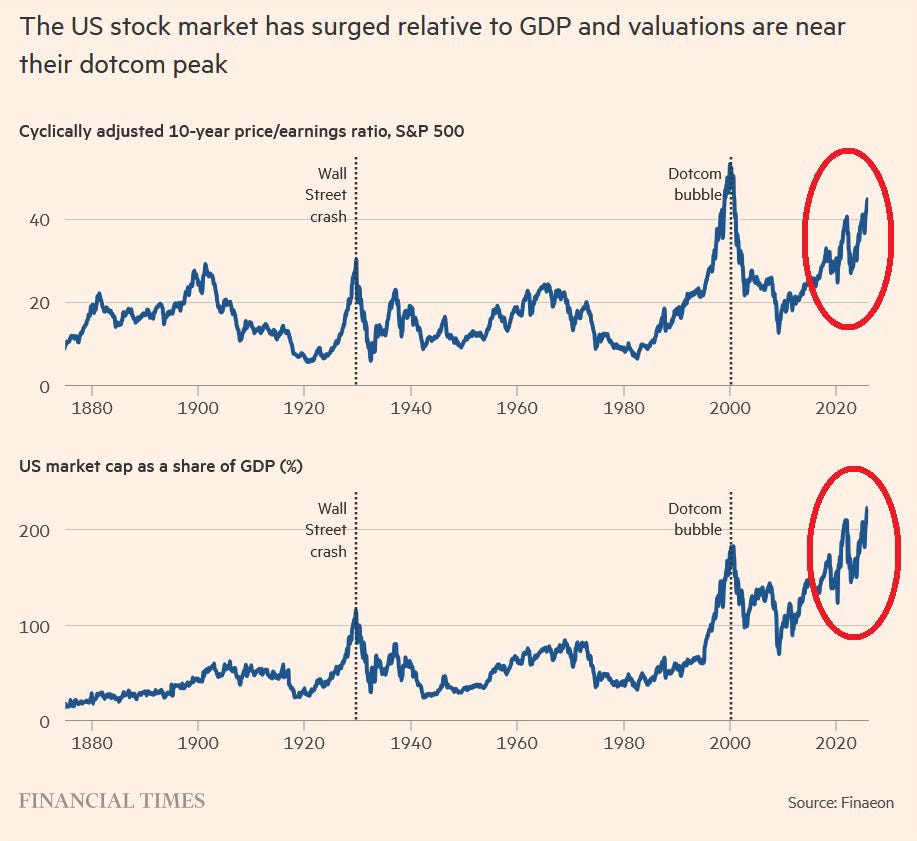 Den amerikanska aktiemarknaden befinner sig just nu på värderingsnivåer som överträffar alla historiska föregångare, inklusive de mest extrema topparna före krascherna 1929 och 2000. Det cykliskt justerade P/E-talet (CAPE) för S&P 500 har klättrat till 45, vilket närmar sig nivåerna som föregick dotcomkraschen. Samtidigt uppgår börsvärdet som andel av BNP till rekordhöga 224%. Det innebär att den samlade värderingen av börsnoterade amerikanska företag nu är mer än dubbelt så stor som hela den amerikanska ekonomin.