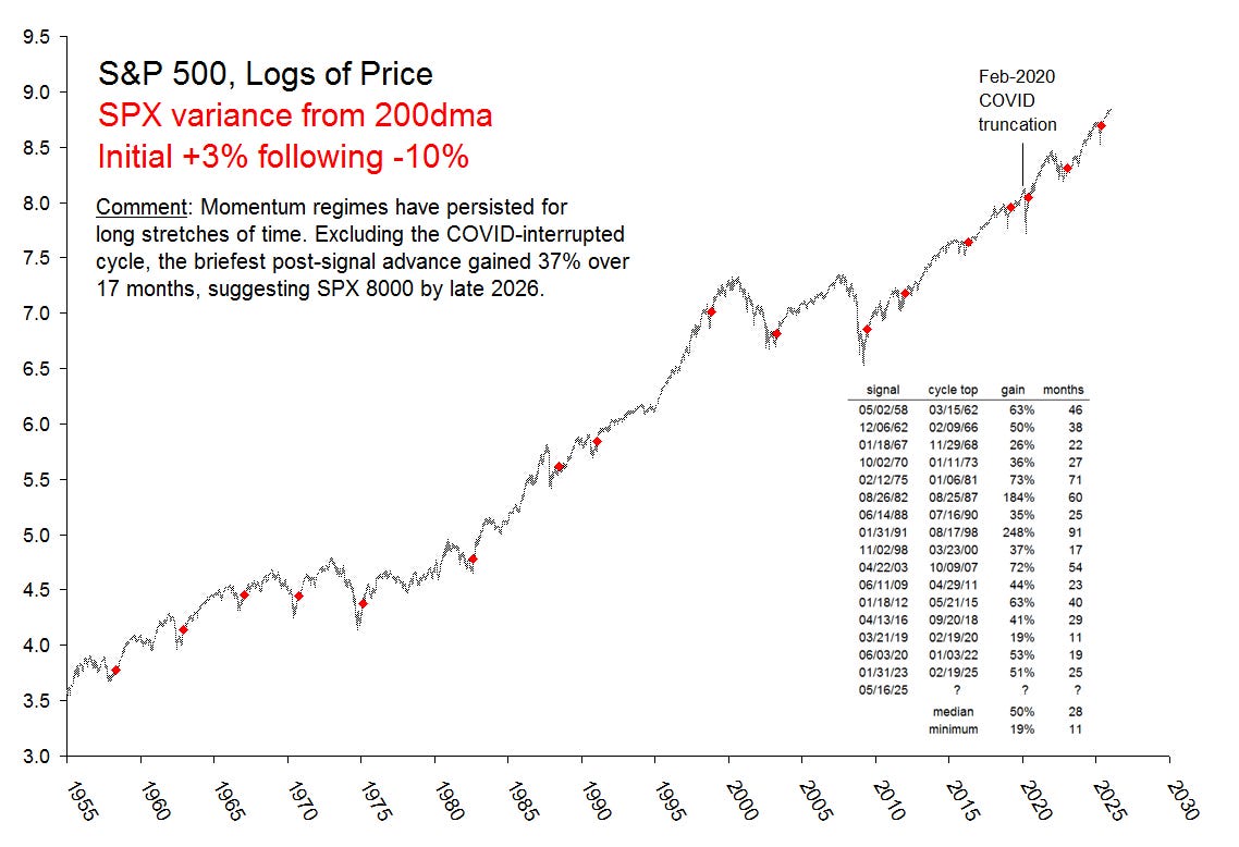 Här ser vi tydligt hur så kallade momentumregimer (där marknaden återhämtat sig efter att ha noterats minst 10% under 200-dagarsmedelvärdet och därefter över 3%) ofta följs av kraftiga och långvariga uppgångar i S&P 500. Sedan 1958 har denna signal dykt upp vid ett tjugotal tillfällen och historiken visar att dessa faser i genomsnitt varat i över två år med en medianavkastning på omkring 50%.